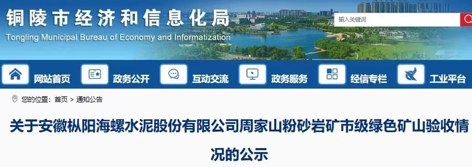 近日,安徽省銅陵市經(jīng)濟(jì)和信息化局發(fā)布關(guān)于安徽樅陽(yáng)海螺水泥股份有限公司周家山粉砂巖礦市級(jí)綠色礦山驗(yàn)收情況的公示。